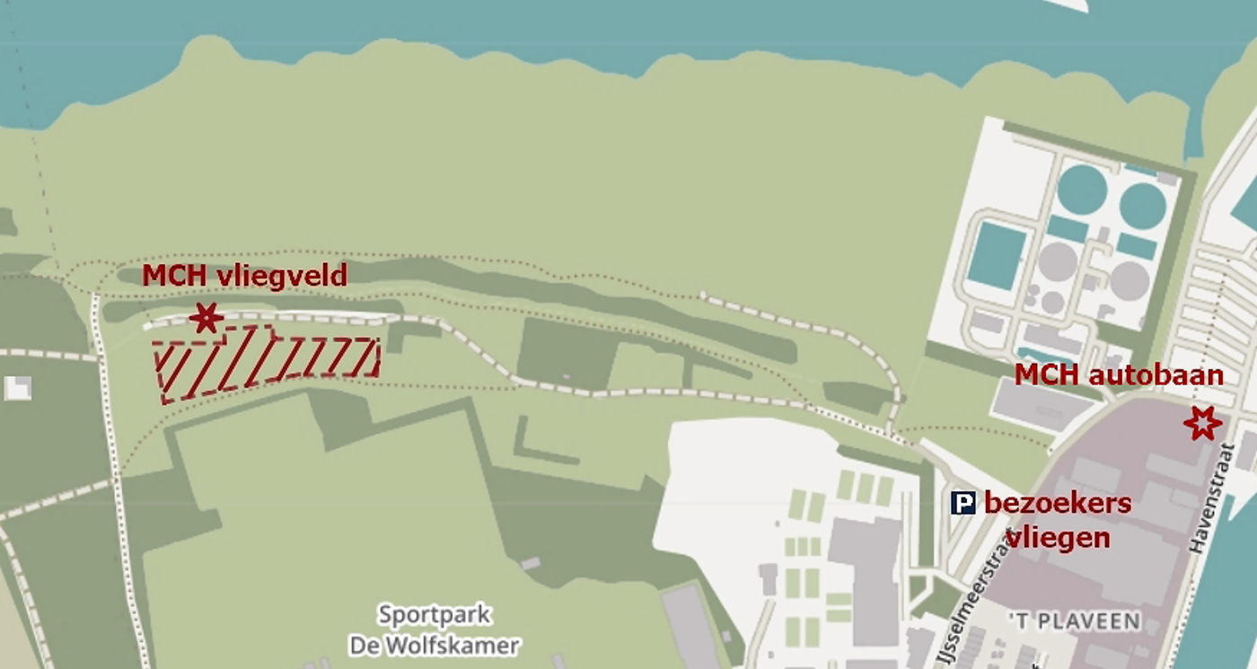 De ingang van het modelvliegveld is in de hoek van het parkeerterrein naast Coronel Sport.
